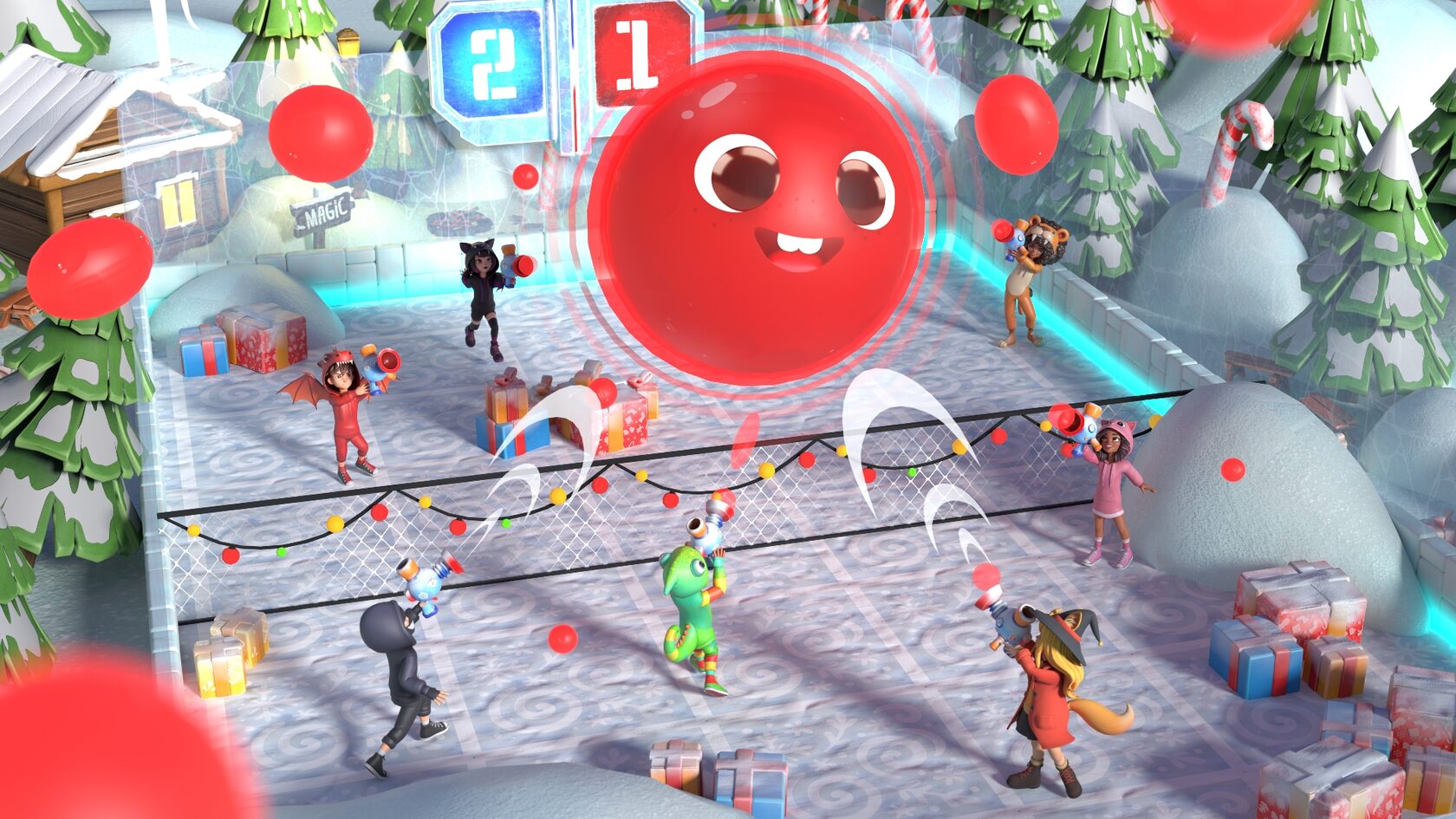 В центре карты расположена сетка. Над ней появляется большое круглое желе. У игроков в правой руке находятся пушки. С помощью выстрелов игроки могут перемещать желе по полю. Цель — сделать так, чтобы желе коснулось пола на половине поля соперника.